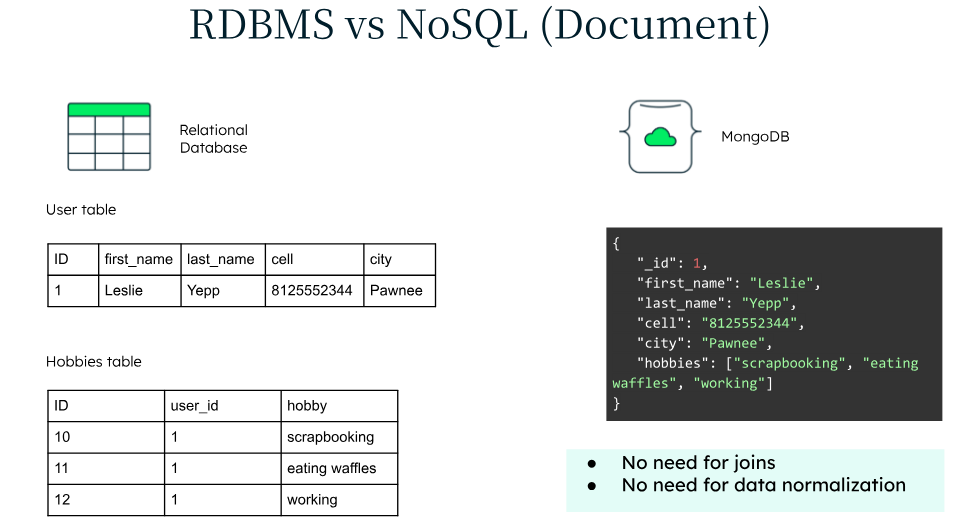 | Examples | PostgreSQL, MySQL | MongoDB, Redis |